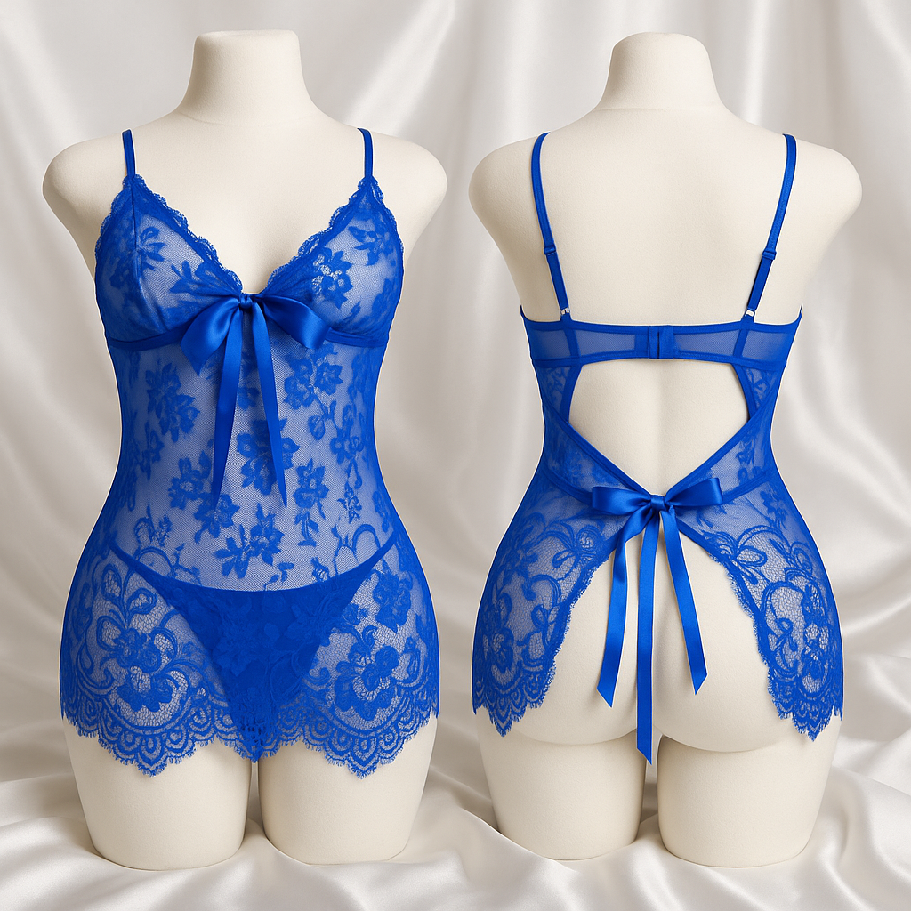 What happens behind the scenes becomes the main event in Backstage Secrets. A sheer lace top with stocking clips and a crisscross open back pairs with a matching open-V thong featuring a playful front bow. It’s lingerie that speaks fluently in foreplay.